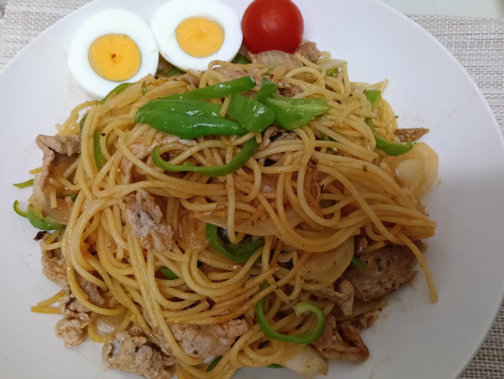 豚肉のナポリタンは、あ、ベーコンとかないな、豚肉がある!ご飯炊いてないなぁ。スパゲッティーでいっかぁ~。という感じで決めます。